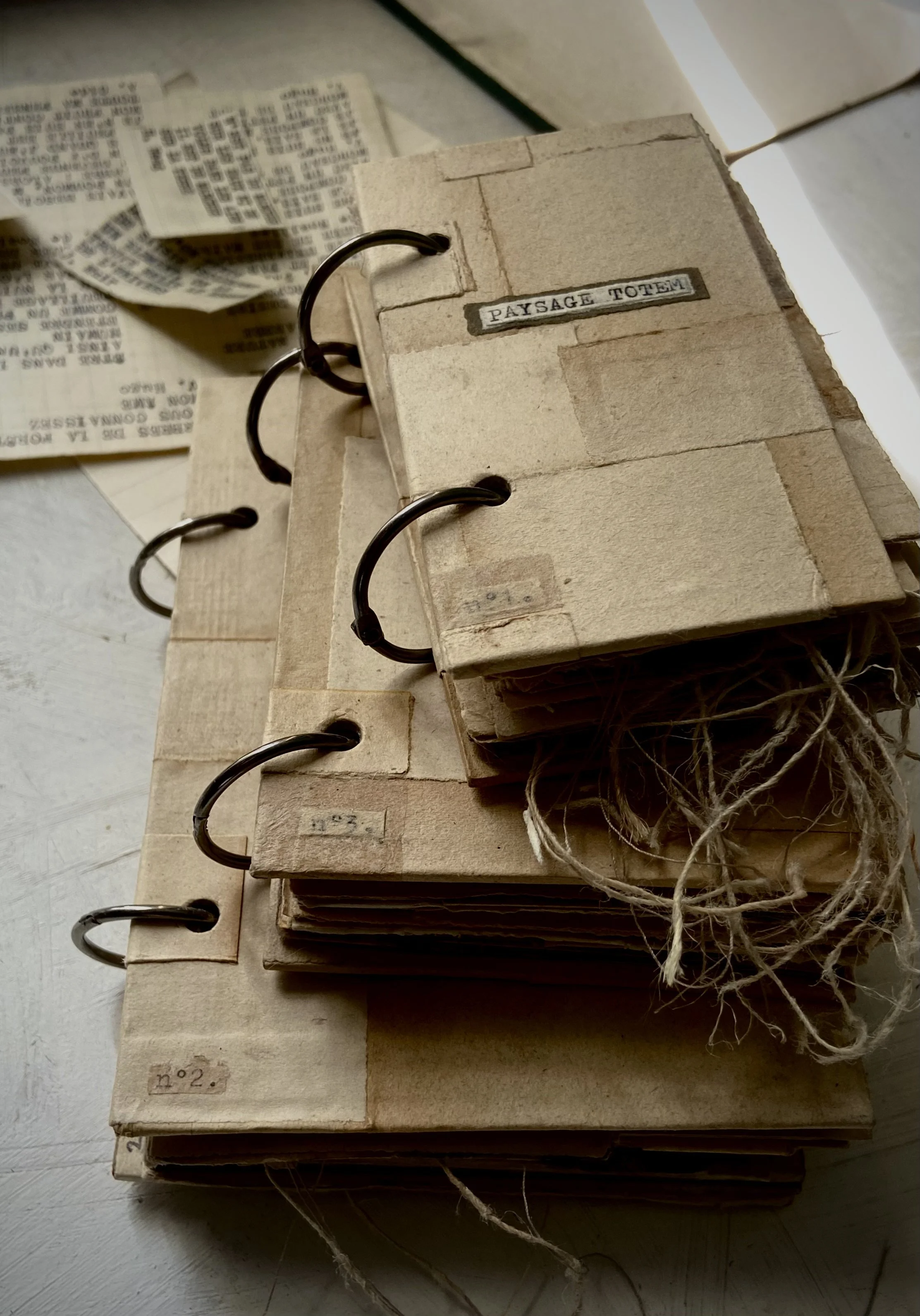 Voilà ! La version finale des livres uniques PAYSAGE TOTEM. Ça fait plusieurs années que j’explore des petites séries de cahiers et carnets boîtes, autour du texte sur vieux papier et impression végétale.